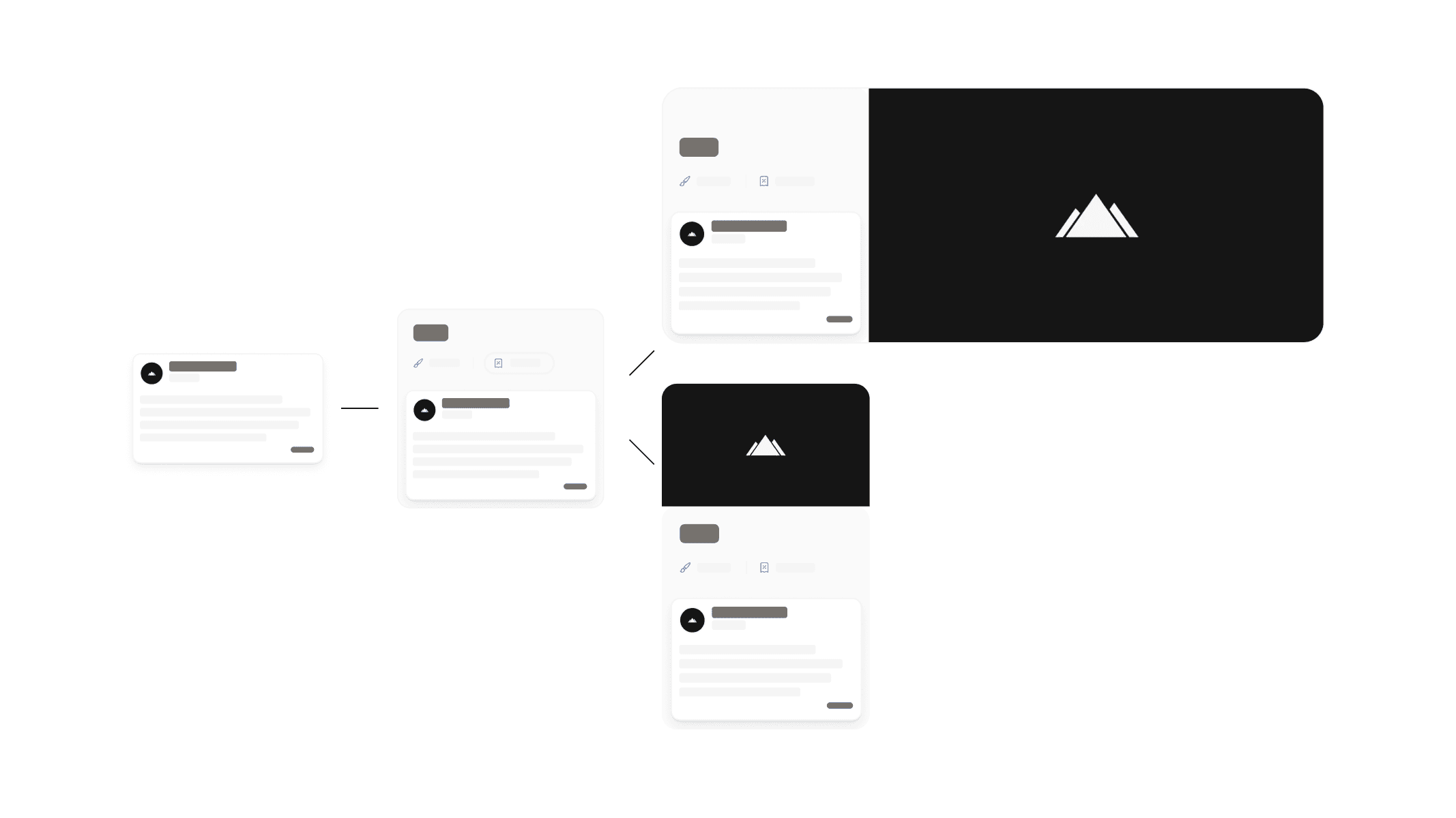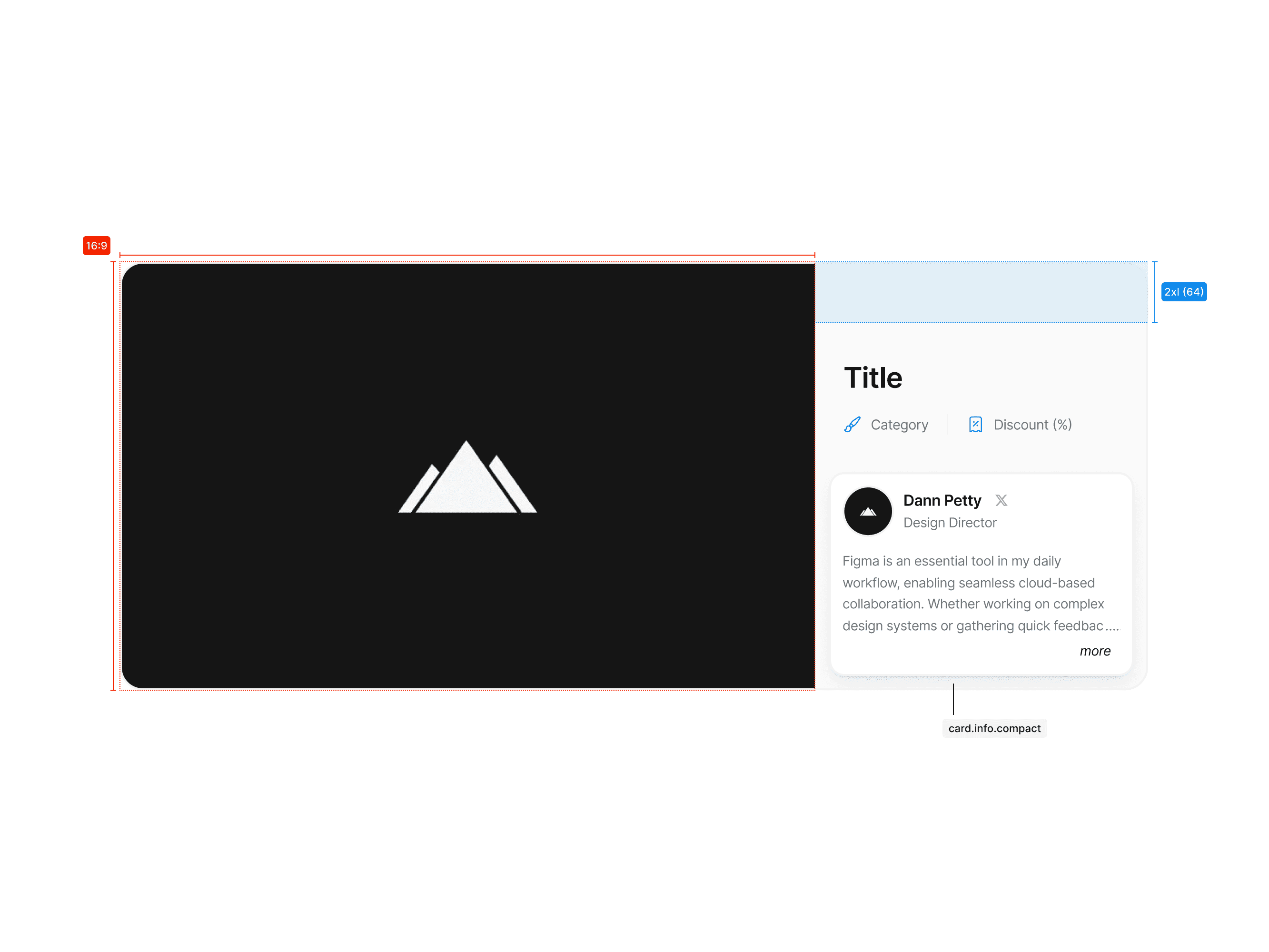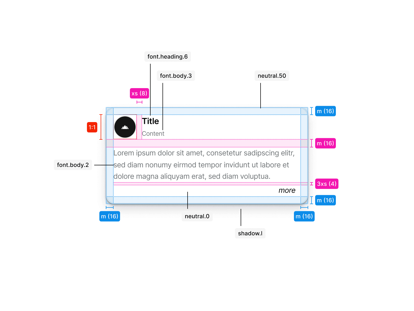 Info cards are structured to build upon each other as content increases. Card.info.compact is based on card.info.reduced, while card.info.image.compact adds an image to the layout. Card.info.image.extended displays this image in a horizontally enlarged format. Each variant builds on the previous one, complemented by additional padding, backgrounds, or outlines. The exact tokens and their applications can be seen in the illustration.