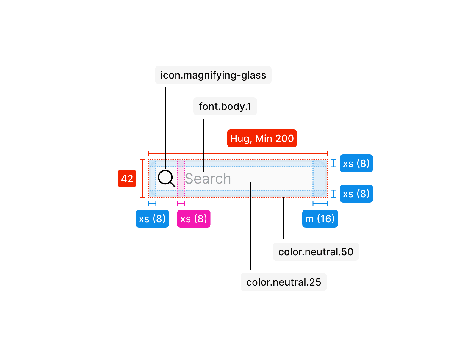 The search field has the same height as button.l, with a minimum width of 200px to ensure that the entered query remains visible at all times. Background and outline align with the styling of button.secondary. The spacing between icon and text follows the spacing rules and is set to spacing.s.