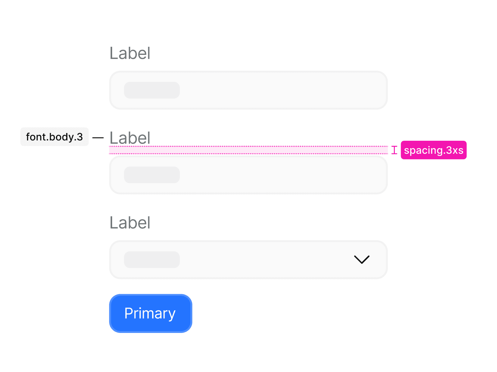 Always apply font.body.3 for labels and position them above the input field with spacing.3xs to maintain a clear and uniform structure.