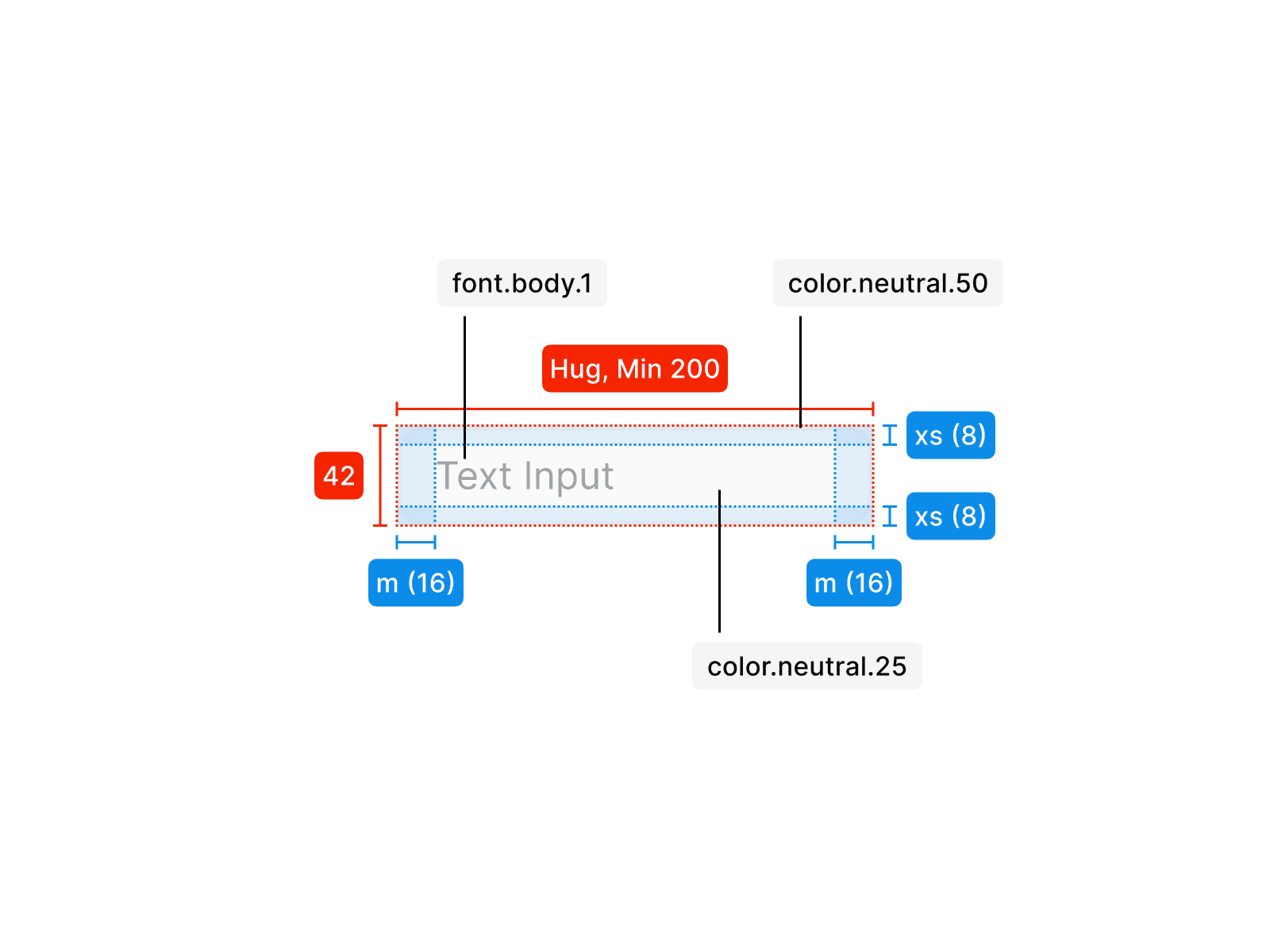 Input fields follow the established rules of spacing, color, and typography, while building on the foundational structures of button.secondary.l and button.primary.l. The exact tokens and applications can be seen in the illustrations.