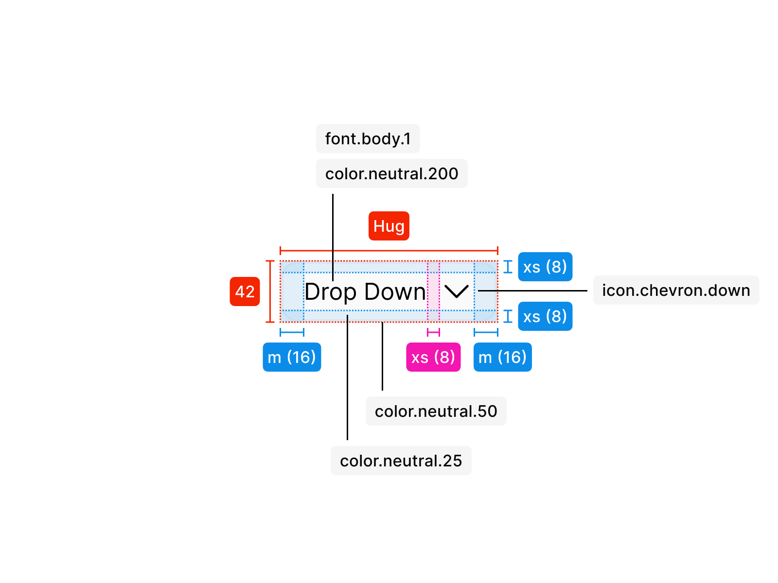 The dropdown has the same height as button.l, with a hug width ensuring that the selected option remains visible at all times. Background and outline align with the styling of button.secondary. The spacing between icon and text follows the spacing rules and is kept minimal with spacing.s.